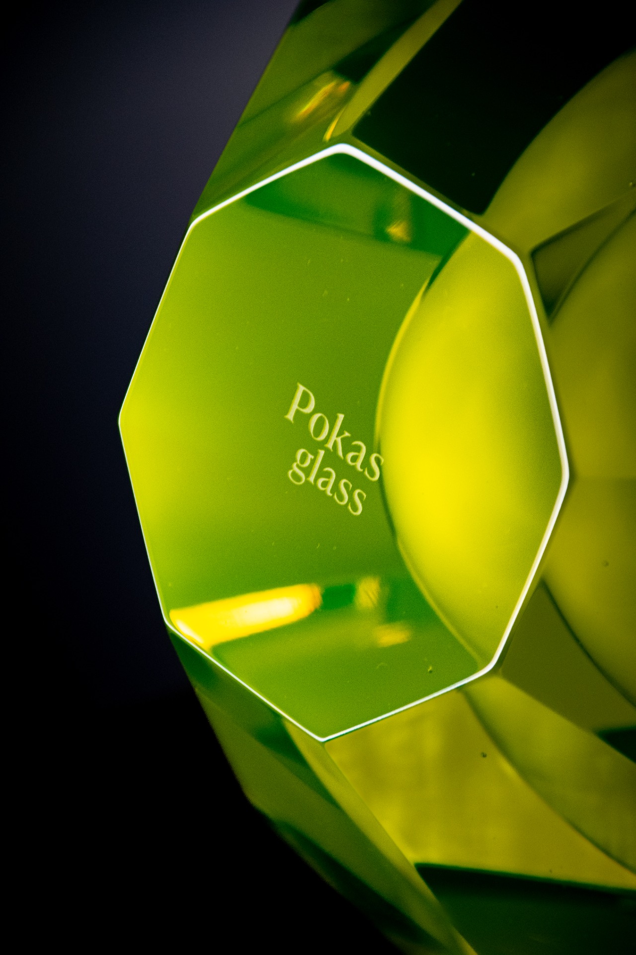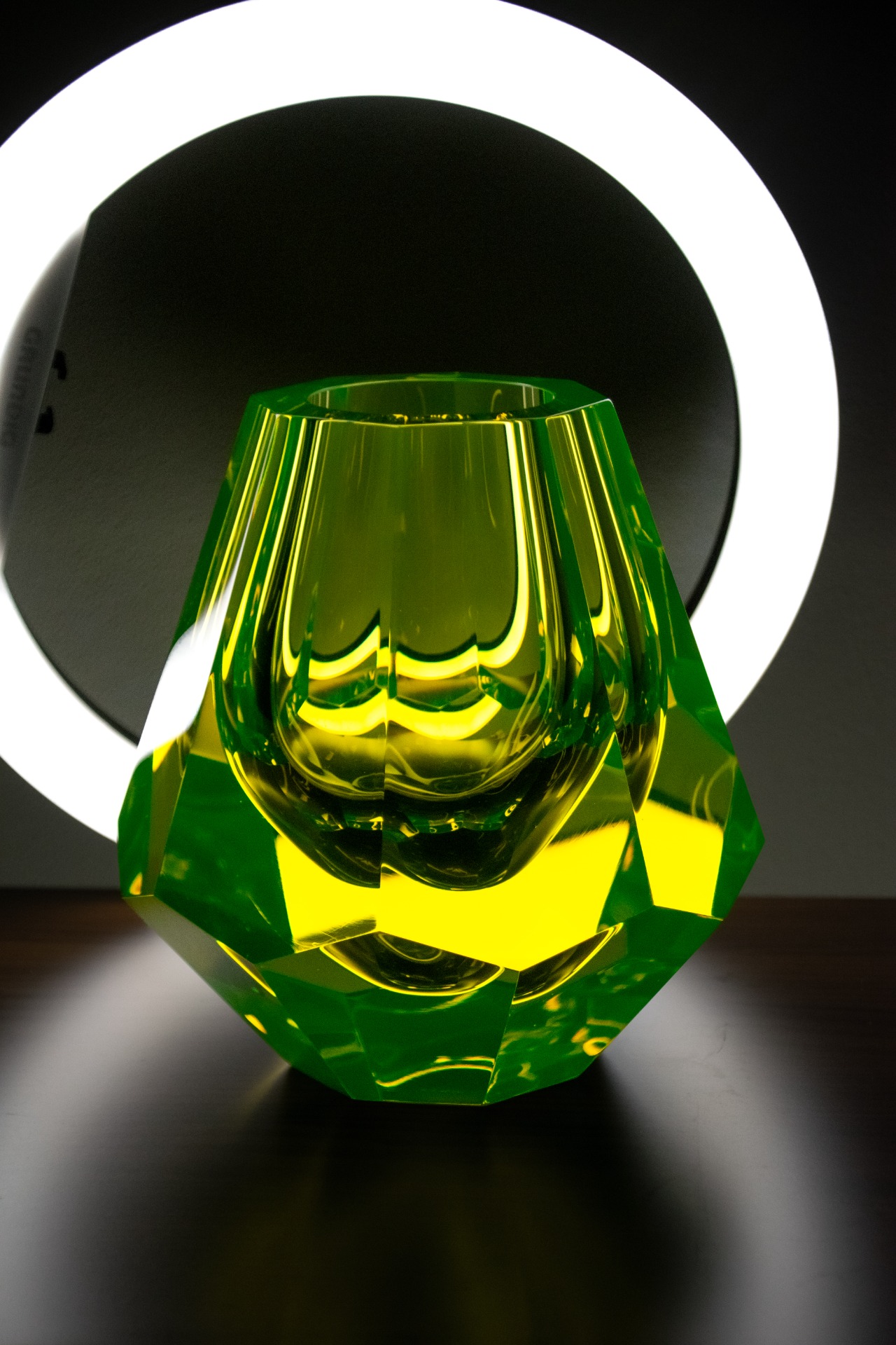Originální designová váza z masivního uranového skla s výrazným hranovaným broušením. Geometrické linie a sytě zelený odstín skla vytvářejí zajímavé světelné odlesky a dodávají váze výrazný, luxusní charakter. Dostupná ve variantě s opálovým středem nebo v celouranovém provedení. Ideální jako stylová dekorace.